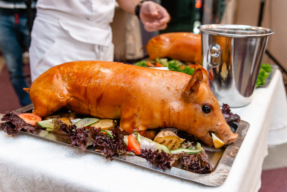 - Spanferkel – Unser ganzes Spanferkel ist der Star jeder größeren Feier. Knusprig gegrillt mit goldbrauner Kruste – ein Erlebnis für alle Sinne und ein echter Hingucker auf jedem Buffet.